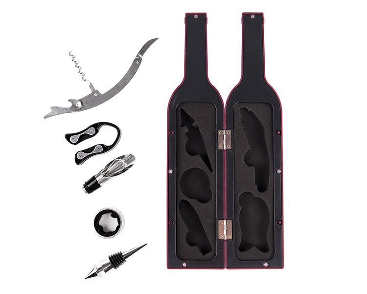 - 5-piece set includes a stainless-steel corkscrew with foil cutting knife, drip-stop collar, combination wine pourer/stopper, and foil cutter.