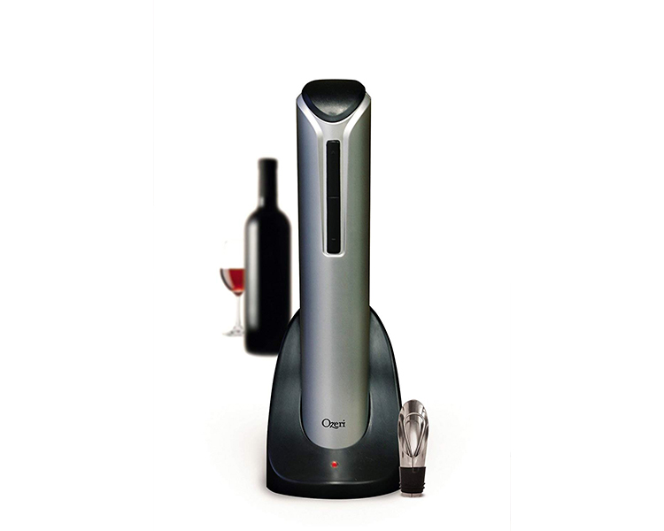 The Ozeri Pro Electric Wine Opener makes opening wine bottles easy while entertaining your guests at the same time. Designed for home and restaurant use, its latest generation battery now opens up to 40 wine bottles with the gentle push of a button, all on a single charge. The Ozeri Pro Electric Wine Opener is completely cordless. It includes an elegant recharging base with an LED charging indicator and an always needed foil cutter to remove wine seals. This new edition of the Ozeri Pro Electric Wine Opener includes a bonus wine pourer and stopper. The Ozeri Pro Electric Wine Opener opens both natural and synthetic corks. It also features an improved and new ultra light-weight design, a faster motor and an ergonomic grip for effortless handling. Use it at home or take it with you to impress your hosts and guests before the first sip.