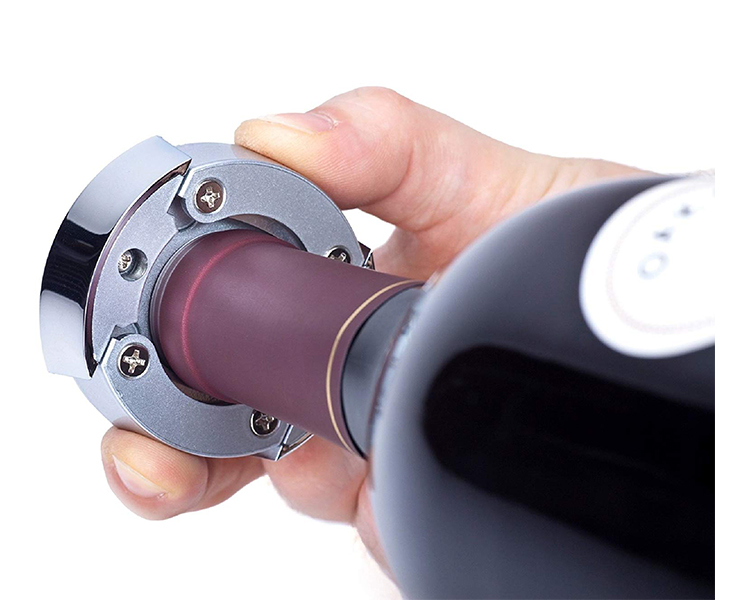 - Ships with a wine pourer and stopper and a patent-pending removable lid that converts into a foil cutter.