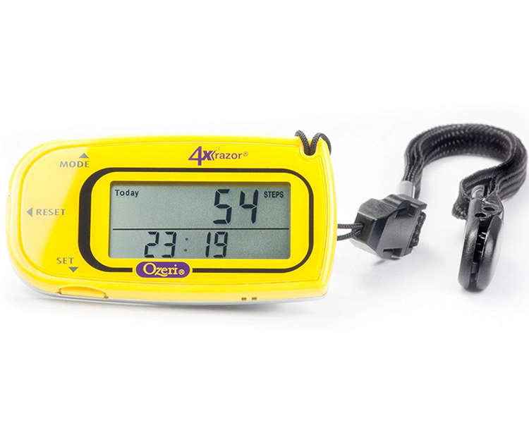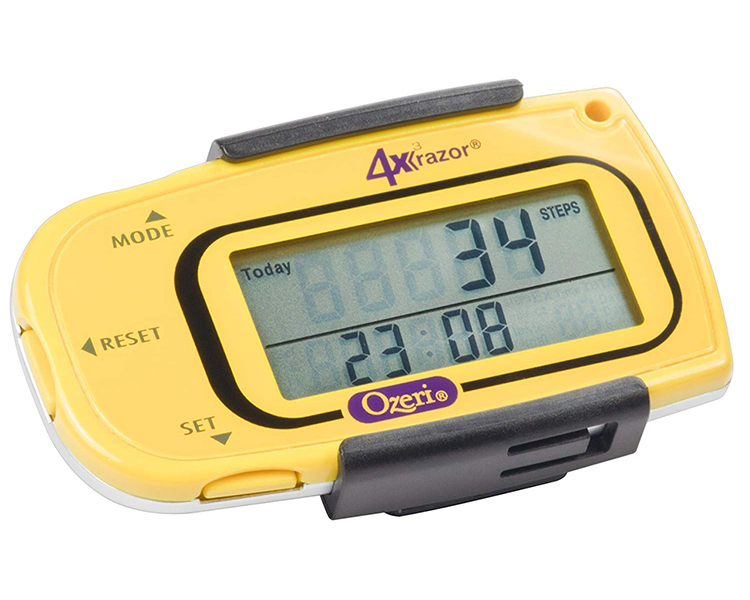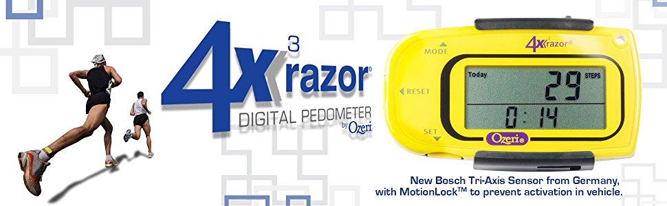 It includes a detachable lanyard and belt clip for the ultimate convenience. A personal trainer par excellence, the 4x3razor is used by professional 100 mile ultra-runners to accurately record steps, distance, calories consumed, fat burned and exercise time. This advanced digital pedometer counts up to 1 million steps with 30-Day Memory, and includes a built-in Clock and Sports Timer with Auto Sleep technology. The 4x3razor now features MotionLock to prevent unintended motion detection, such as when traveling. It also filters out vibrations and only begins counting after it detects a sequence of continuous steps for greater accuracy. The 4x3razor Digital Pedometer ships with an installed and extra Lithium battery, a belt clip and detachable lanyard and instruction manual. Your satisfaction is 100% guaranteed.