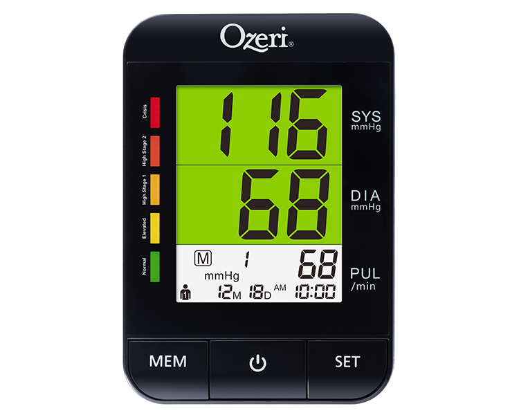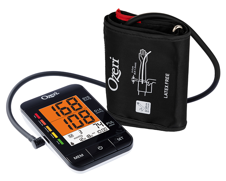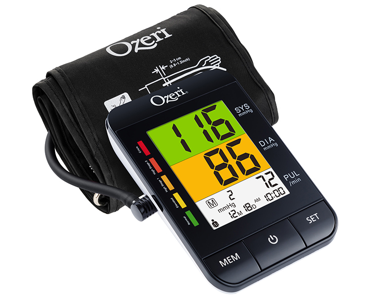 Compact, portable and simple to use, the CardioTech BP9W Arm Blood Pressure Monitor is an advanced arm-cuff monitor with Split-Screen Color Alert Technology. Traditional blood pressure monitors base their hypertension indicators on the combined results of systolic and diastolic blood pressure, without guidance as to whether the systolic or diastolic may require specific attention. The new Ozeri BP9W Blood Pressure Monitor take the anxiety out of interpreting measurement numbers by automatically classifying each BPM reading according to the American Heart Association’s hypertension latest guidelines, in split-screen colors, with separate hypertension color indicators for systolic and diastolic measurements. The colors range from green (normal), to yellow (elevated), light orange (hypertension stage 1), dark orange (hypertension stage 2), and red (crisis). The BP9W stores up to 1197 blood pressure readings (399 x 3 users) with date and time recall. It also calculates average blood pressure readings, and detects irregular heartbeat (Arrhythmia) for an improved understanding of your heart’s health. The BP9W automatically inflates to the appropriate level (no adjustments required) based on real-time blood pressure detection, thereby reducing measurement time and offering greater accuracy. This advanced capability adds convenience and ease of use to those with heart conditions, such as arrhythmia, that lead to fluctuating blood pressure. Backed by a 5 year warranty, the Ozeri CardioTech BP9W ships with 4 AAA (batteries included), a medium sized arm cuff included (9’’-17’’/22-42cm), a carrying case and an easy-to-follow user manual.