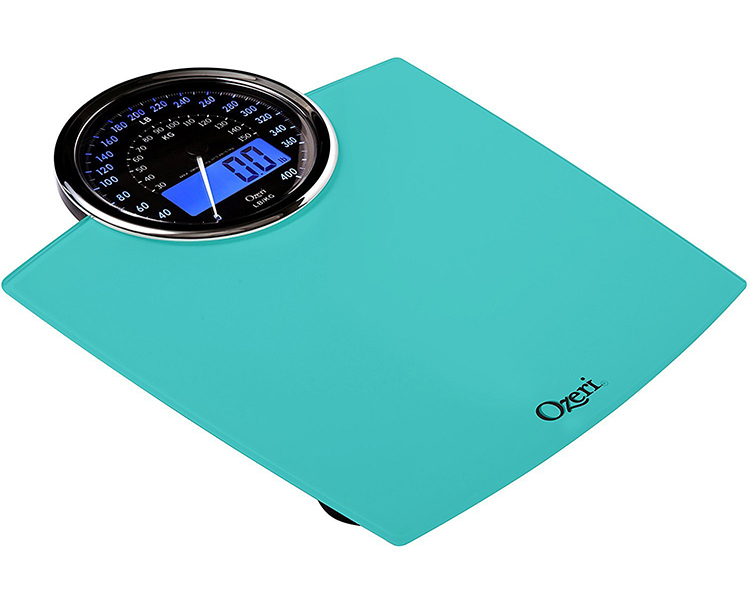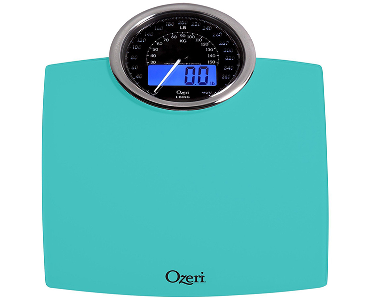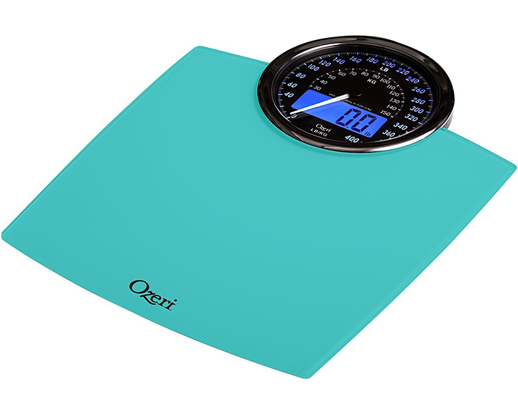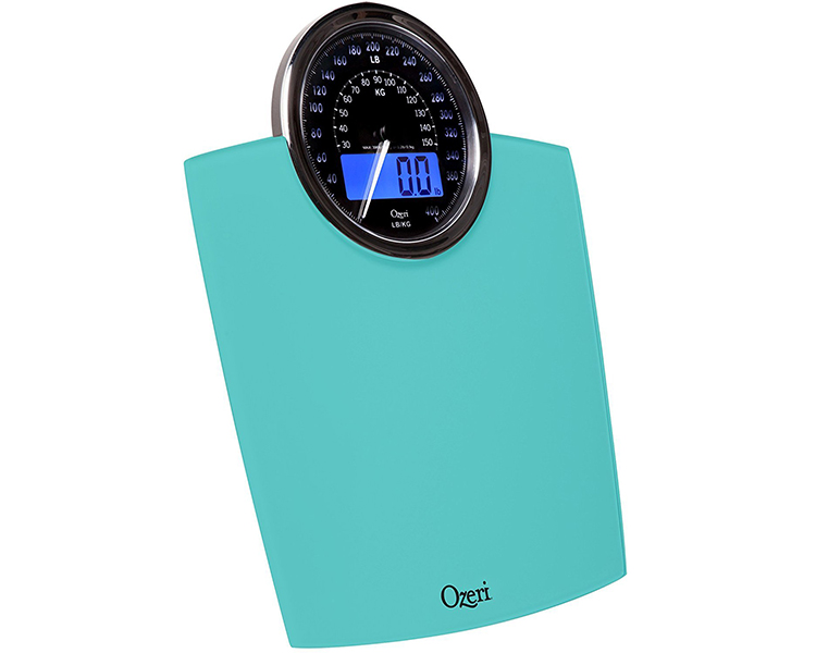 The Ozeri Rev Digital Bathroom Scale with Electro-Mechanical Weight Dial is the world's first weight scale to incorporate a synchronized electro-mechanical Dial and LCD that automatically illuminate and point to your weight in lbs and kg, for easy-to read results in all light conditions and from any angle. Boasting a visually arresting design, the Ozeri Rev scale features a huge 5.5 inch mechanical dial with an integrated digital blue-backlit LCD, accented by stylish chrome to create a distinctive retro look, and displays digital results with class-leading 50 gram Sensor Technology. This professional quality scale features an oversized platform made of impact-resistant tempered glass with slip-resistant feet for ideal stability, and a new built-in alarm that reminds you to measure your weight at the same time each day.