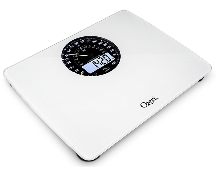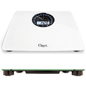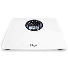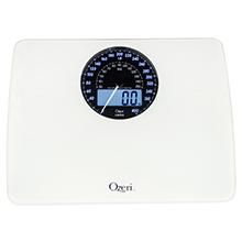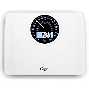 The Ozeri Rev Digital Bathroom Scale with Electro-Mechanical Weight Dial is the world's first weight scale to incorporate a synchronized electro-mechanical Dial and LCD that automatically illuminate and point to your weight in lbs and kg, for easy-to read results in all light conditions and from any angle. Boasting a visually arresting design, the Ozeri Rev scale features a huge 5.5 inch mechanical dial display with an integrated digital blue-backlit LCD, accented by stylish chrome to create a distinctive retro look, and displays digital results with class-leading 50 gram Sensor Technology. This professional quality scale features an oversized platform made of impact-resistant tempered glass with slip-resistant feet for ideal stability, and a new built-in alarm that reminds you to measure your weight at the same time each day. The Ozeri Rev Digital Bathroom Scale uses 4 high-precision sensors that weigh up to 400 lbs (180 kg) in 0.1 lbs or 0.05 kg (50 gram) increments. Whether your goals are weight loss or muscle gain, the Ozeri Rev features the latest generation of StepOn technology to display your precise body weight upon stepping onto the scale, with no tapping required. The Ozeri Rev Digital Bathroom Scale is auto-calibrated and automatically turns off to conserve battery life. It runs on 3 AA batteries (included) and features a Low Battery Indicator. Your Satisfaction is 100% Guaranteed.