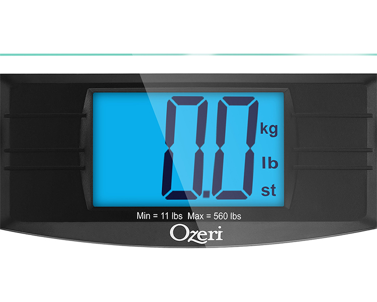 The Ozeri ProMax 560 lbs (255 kg) Digital Bath Scale features the highest weighing capacity for the most demanding muscle-building and weight-loss applications. Equipped with auto calibration and 50 gram sensor technology, the Ozeri ProMax Scale boast weighing precision capability of 0.1 lbs / 0.05 kg – a 100% improvement over the 0.2 lbs / 0.1 kg graduation found on standard weight scales. The Ozeri ProMax uses 4 custom engineered sensors to capture weights up to 560 lbs or 255 kg, with industry-leading 50 gram graduation accuracy. It accurately displays results on its latest generation 4.3" blue backlight LCD, providing clear and easy-to-read results under all ambient light conditions, and from virtually any angle.