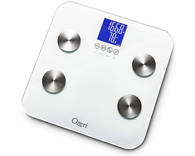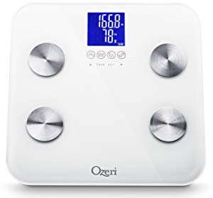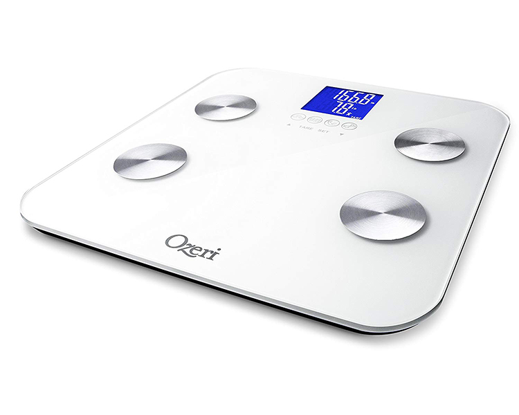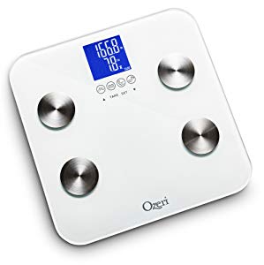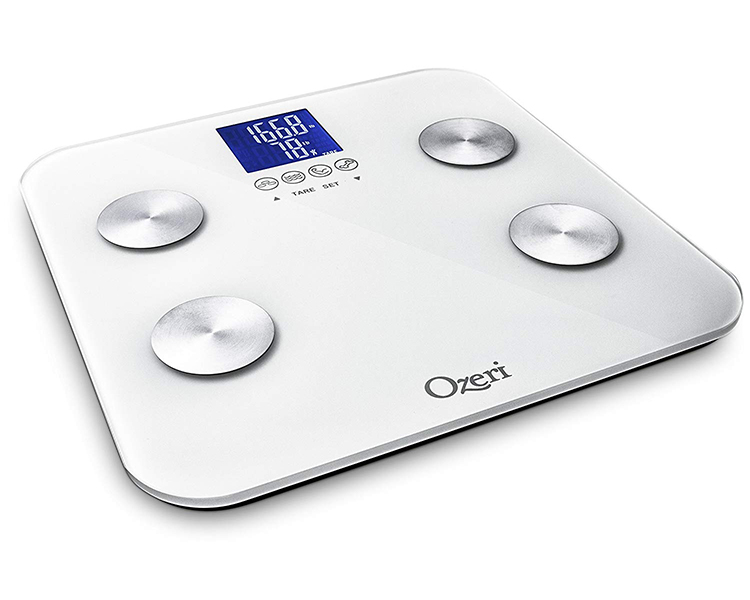 Newly updated, the Ozeri Touch 440 lbs Total Body Scale now provides instant adult and infant weight measurements, and calculates body fat, hydration, muscle mass and bone measurements. Embedded with StepOn technology, it automatically powers on upon contact and features 3 touch sensitive buttons for easy operation. It also features 4 icons that automatically illuminate on the screen for body fat, hydration, muscle and bone measurements. The Ozeri Touch includes built-in memory for up to 8 users with auto recognition technology for shared use at home, the office or the gym. Each profile stores weight, gender, height, and age data so that your family members can each track their progress. The Ozeri Touch Total Body Scale combines advanced algorithms with bioelectrical impedance analysis (BIA), incorporating a person's age, height, gender and weight, for its accurate measurements. BIA is a well-established and respected method used to estimate body fat, hydration, muscle mass and bone measurements. The Ozeri Touch Total Body Scale displays all results on its easy to read high-contrast LCD screen.