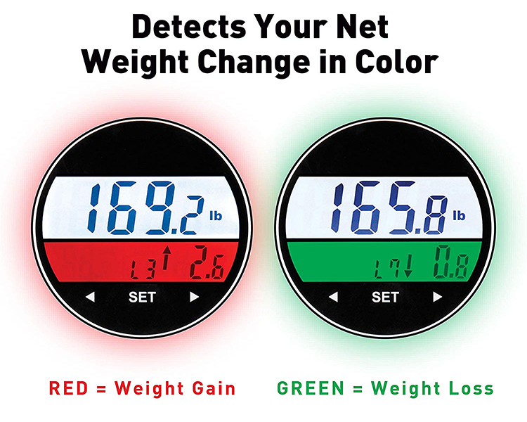 - Smart LCD with Color Alert Technology – allows you to focus on your weight trend instead of the actual numbers by displaying your weight change in color, with a GREEN illumination for weight loss and RED illumination for weight gain.