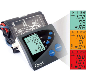 Smart Hypertension Indicator displays Systolic and Diastolic readings in green (normal), orange (prehypertension) and red (hypertension).