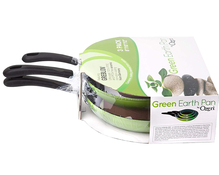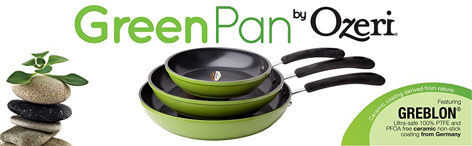 The Green Ceramic Pan Set by Ozeri includes an 8", 10" and 12" frying pan that each offers a non-stick solution while remaining free of PTFE, perfluorinated chemicals (PFCs) such as PFBS, PFAS, PFOS and PFOA, APEO, GenX, and the lesser known chemicals NMP and NEP. According to the FDA, many of these chemicals constitute a worrisome class of nonstick and stain-resistant compounds that have found their way into the food chain, including grocery store meats and seafood. A federal toxicology report has linked a number of health concerns to the presence of these compounds in people’s blood. Conventional pans sometimes achieve their non-stick performance through a waxy synthetic coating of PTFE (PolyTetraFluoroEthylene), which under extreme temperatures begins to decompose and release fumes that can be harmful to humans and pets. Additionally, conventional may also utilize non-stick coatings made with the aid of per- and polyfluoroalykyl chemicals, also known as PFCs (PFBS, PFAS, PFOS, PFOA), which the EPA has cited as potential carcinogens and classified as a 'persistent pollutant of the environment,’ and APEO (Alkylphenol ethoxylates), which are restricted in Germany due to environmental concerns and toxicity in the food chain.