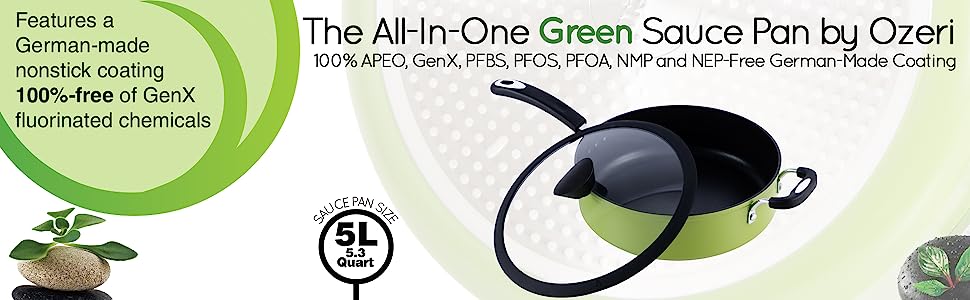 - Eco-friendly 5 L (5.3 Quart) sauce pan delivers unprecedented non-stick performance without risk of exposure to these controversial chemicals.
