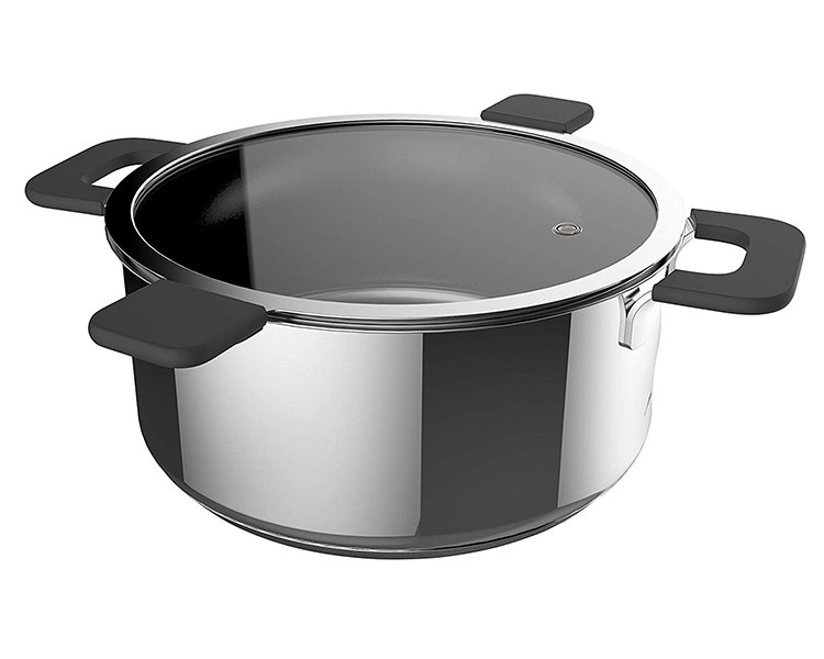 - Uniquely fitted lids made of tempered glass, each with a Steam-Release vent and two heat-resistant silicone-coated handles.