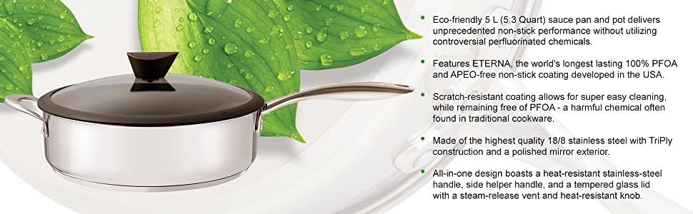 - Eco-friendly 5 L (5.3 Quart) sauce pan and pot delivers unprecedented non-stick performance without utilizing controversial perfluorinated chemicals.