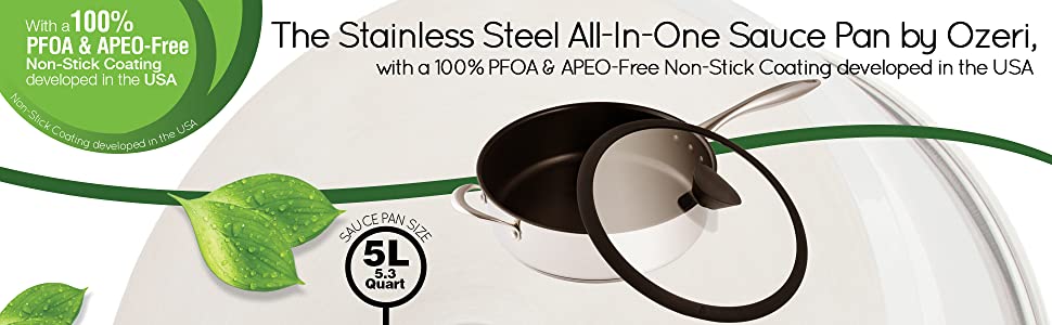 Featuring ETERNA -- a safe and durable non-stick coating developed in the USA, the All-In-One Stainless Steel Sauce Pan by Ozeri achieves non-stick perfection without using PFOA or APEO -- harmful chemicals often found in traditional cookware. Conventional sauce pans achieve their non-stick performance with the aid of PFOA (PerFluoroOctanoic Acid), which the EPA has classified as a 'persistent pollutant of the environment' and APEO (Alkylphenol ethoxylates), which are under restricted use in Germany due to environmental concerns about their poor biodegradability and toxicity in the food chain. According to the EPA, once ingested, PFOA is capable of remaining in people for a very long time, and has been shown to cause developmental and other adverse effects in laboratory animals. Likewise, European studies have shown that APEO may be toxic to aquatic life, and has the potential to act as endocrine disrupters. With the Stainless Steel Sauce Pan's ETERNA coating, even under high temperatures, no such controversial perfluorinated chemicals are ever passed on to you, or released into the environment.