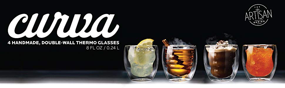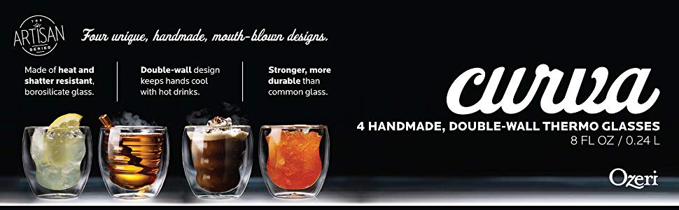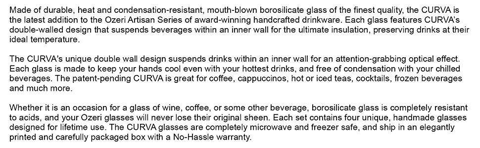 The patent-pending CURVA is great for coffee, cappuccinos, hot or iced teas, cocktails, frozen beverages and much more. Whether it is an occasion for a glass of wine, coffee, or some other beverage, borosilicate glass is completely resistant to acids, and your Ozeri glasses will never lose their original sheen. Each set contains four unique, handmade glasses designed for lifetime use. The CURVA glasses are completely microwave and freezer safe, and ship in an elegantly printed and carefully packaged box with a No-Hassle warranty.