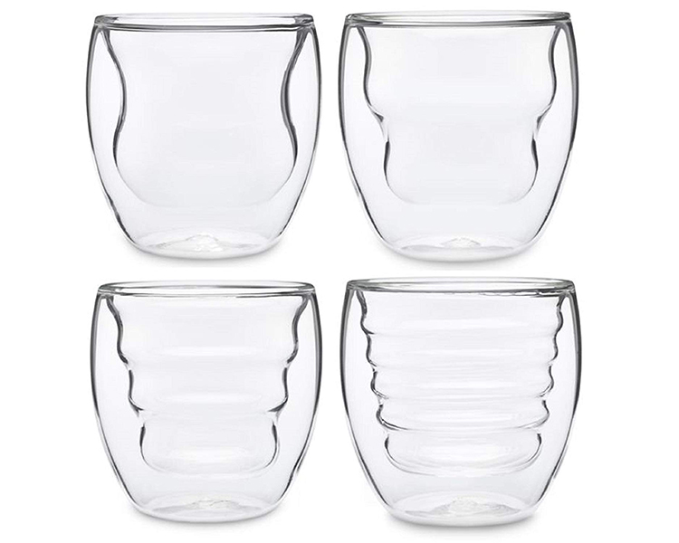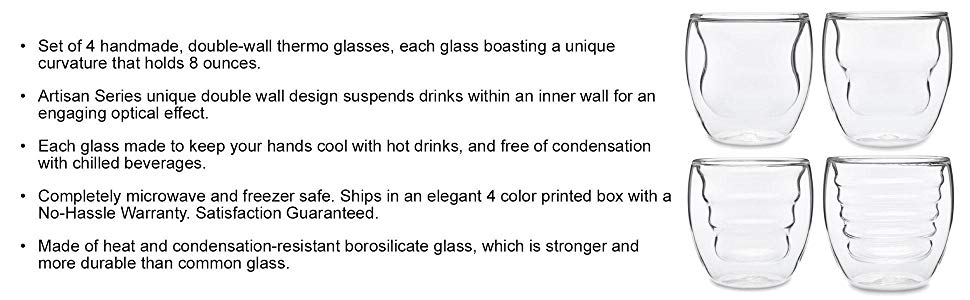 - Set of 4 handmade, double-wall thermo glasses, each glass boasting a unique curvature that holds 8 ounces