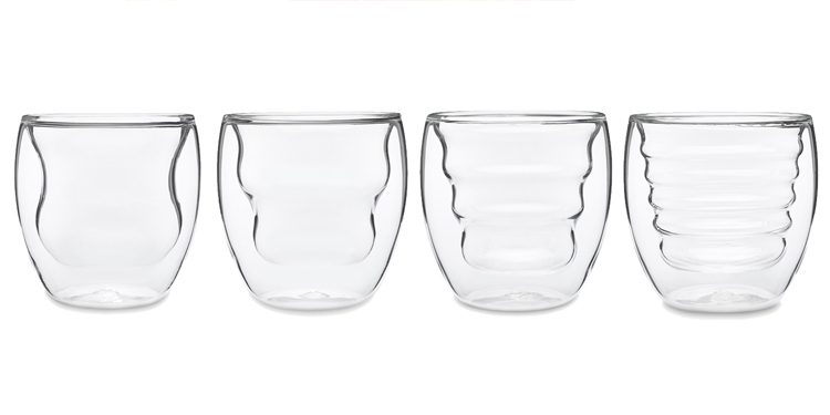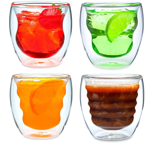 Set of 4 handmade, double-wall thermo glasses, each glass boasting a unique curvature that holds 8 ounces.