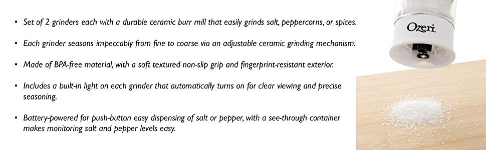 - Includes a built-in light on each grinder that automatically turns on for clear viewing and precise seasoning.