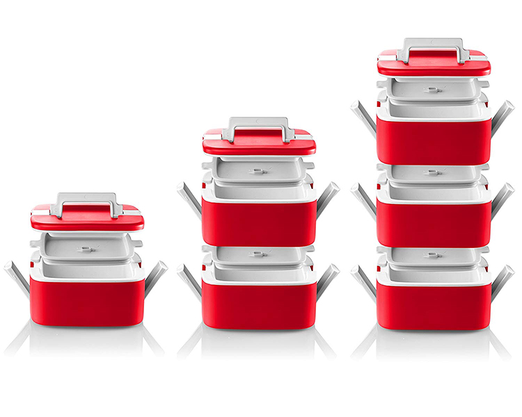 - Fully stackable with secure locking mechanisms for traveling with a hot and cold dish (mix and match colors)