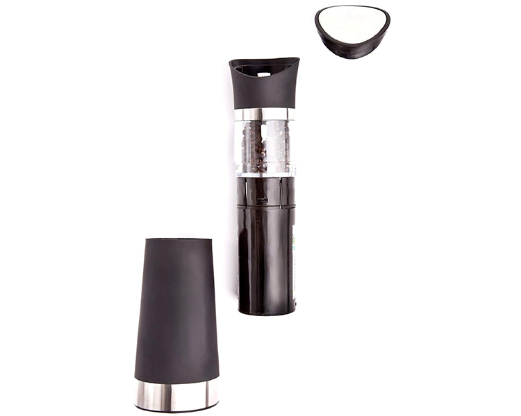 Designed for one-handed operation, the sleek and stylish Ozeri Graviti Pro Electric Pepper Grinder automatically activates when inverted for effortless dispensing of freshly ground seasonings. The elegantly designed Graviti Pro boasts a transparent storage container for your fresh peppercorn or salt and a top-mounted grind adjustor that never leaves a trail or mess. Also featuring a fingerprint-resistant ultra-soft grip, the attention-grabbing Ozeri Graviti Pro is equally at home in the hand of a fast paced cook as it is on any elegantly set dining table.