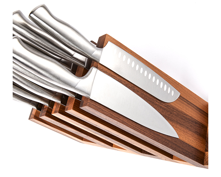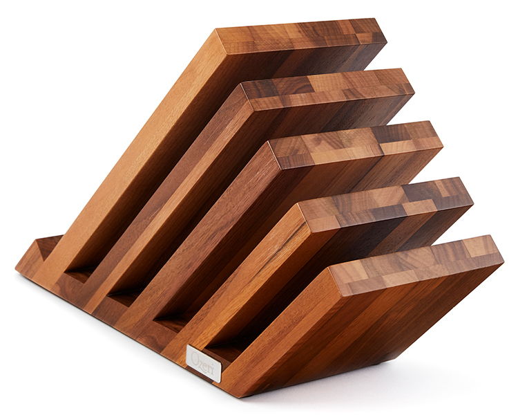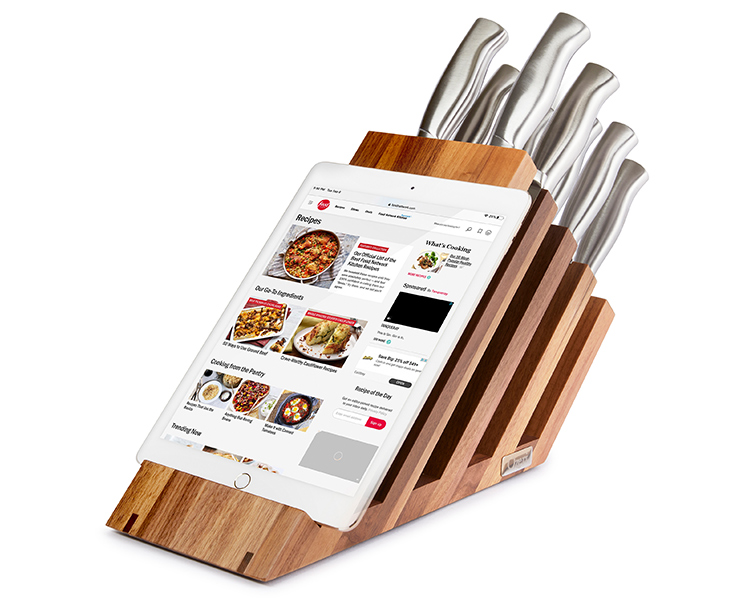 Thoughtfully designed with a tablet holder for easy access to your favorite recipe apps, the Italian-made Ozeri Magnetic Knife Block and Tablet Holder empowers the modern chef to be inspired by one’s favorite cooking videos and recipes, while cutting, chopping, mincing and slicing. Durably made for lifetime use and likely to outlast all but the finest cutlery, the Ozeri Knife Block is exclusively made in Italy with artisan craftsmanship accumulated from over 2 passionate generations of transformative carpentry, resulting in an innovative open air design that prevents mold and rust while maintaining both functionality and an elegant form. In keeping with the adage “leave the world a little better than you found it”, the Ozeri Magnetic Knife Block uses sturdy wood sourced from European Regenerative Agroforestry projects that seek to not only offset the resources needed to make our premium knife block, but also contribute to restoring forestry destroyed by outdated and ecologically irresponsible supply chain sources. For the most secure storage, the Knife Block utilizes powerful Neodymium magnets for easy and quick access to up to 14 knives, while reducing the edge damage caused by repeated insertion into traditional knife blocks. Available in three classic wood colors (Natural Beech Wood, Dark Walnut Wood and Black-Lacquered Beech Wood) to fit any kitchen décor. Made in Italy, your satisfaction is guaranteed. Tablet not included and shown for illustration only.