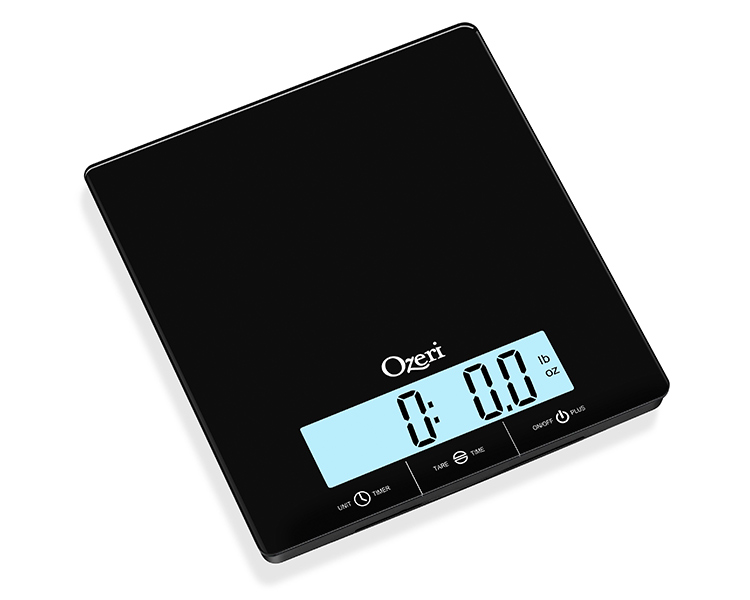 Introducing the Ozeri Touch III 22 lbs (10 kg) Digital Kitchen Scale, in Tempered Glass. Designed to empower, the Ozeri Touch III Multifunction Scale combines precision weighing technology with a built-in Clock, Timer, Temperature & Humidity Gauge. The Touch III is designed to be always on in a low-power state, displaying its clock and weather data. When activated in scale mode, the Touch III impresses with its high-precision sensor technology. The Touch III Multifunction Scale weighs from 0.1 oz to 22 lbs / 1 g to 10 kg in units of 0.1 oz or 1 g. The large LCD screen displays both the ambient room temperature in either Fahrenheit or Celsius and the current humidity. Manufactured for the culinary perfectionist, the Ozeri Touch III features a touch-sensitive Tare button that quickly calculates the net weight of your ingredients by subtracting the container weight and a Unit button for effortless conversion between ounces, pounds, grams, milliliters and fluid ounces. Boasting an impressive 7” by 9” weighing platform and contemporary design, the Ozeri Touch III Multifunction Scale complements any modern kitchen, easily wipes clean, and stores conveniently with its built-in kickstand and hanging notches. It provides both Low Battery and Overload indicators and ships with 4 AAA batteries included.