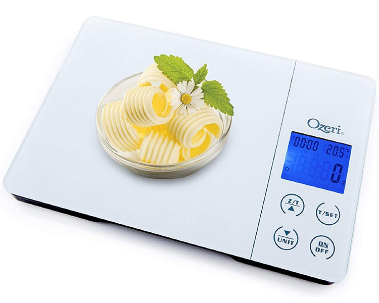 Designed for the culinary perfectionist, the new Ozeri Gourmet Digital Kitchen Scale combines an award-winning wide platform design, a kitchen alarm timer, temperature display, touch sensitive buttons, and the latest in sensor technology for superior accuracy. The Gourmet's 4 touch sensitive buttons provide immediate access to all the scale's functions, including the convenient Unit conversion button and the always handy Tare feature. The uniquely designed wide tempered glass platform provides an oversized weighing area coupled to 4 high-precision GFX sensors that accurately weigh 0.4 oz to 11 lbs or 1 g to 5000 g. The Gourmet ships with 2 AAA batteries included and an easy-access battery compartment (no screwdriver necessary).