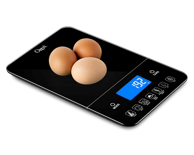Introducing the Ozeri Touch III 22 lbs (10 kg) Baker's Kitchen Scale with Calorie Counter, in Tempered Glass. Designed for baker’s, the Ozeri Touch III Baker’s Scale features a built-in calorie counter that helps you calculate and track your daily caloric intake for 7 of the most commonly weighed baking ingredients (flour, eggs, butter, brown sugar, granulated sugar, oil or milk). Simply place the baking ingredient on the Touch III's large weighing platform, and with the push of a button instant caloric (Kcal) values are displayed on the scale's large high-contrast LED display. Offering the best in form and function, the Ozeri Touch III Baker's Scale features a touch-sensitive Tare button that quickly subtracts the weight of the bowl, tray or plate being used, to calculate the net weight of your ingredients with ease. Used by chefs, dietitians and nutritionists, the Touch III Baker’s Scale is also a most capable multi-purpose food scale and equipped with high-precision sensor technology that weighs from 0.05 oz to 22 lbs / 1 g to 10 kg, in precise units of 0.05 oz or 1 g. The Touch III features a touch-sensitive Unit button for effortless unit conversion between ounces, pounds, grams and milliliters. The Ozeri Touch III 22 lbs (10 kg) Baker's Kitchen Scale boasts a contemporary design that complements any modern kitchen, and ships with 4 AAA batteries included. It provides both Low Battery and Overload indicators, and automatically turns off after 2 minutes of inactivity.