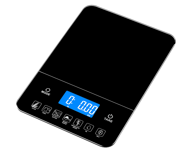 - Touch-button provides instant caloric (Kcal) values based on the portion of flour, eggs, butter, brown sugar, granulated sugar, oil or milk placed on the scale.