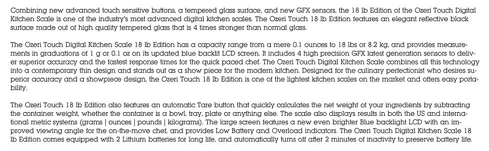 Combining new advanced touch sensitive buttons, a tempered glass surface, and new GFX sensors, the 18 lb Edition of the Ozeri Touch Digital Kitchen Scale is one of the industry's most advanced digital kitchen scales. The Ozeri Touch 18 lb Edition features an elegant reflective black surface made out of high quality tempered glass that is 4 times stronger than normal glass. The Ozeri Touch Digital Kitchen Scale 18 lb Edition has a capacity range from a mere 0.1 ounces to 18 lbs or 8.2 kg, and provides measurements in graduations of 1 g or 0.1 oz on its updated blue backlit LCD screen. It includes 4 high precision GFX latest generation sensors to deliver superior accuracy and the fastest response times for the quick paced chef. The Ozeri Touch Digital Kitchen Scale combines all this technology into a contemporary thin design and stands out as a show piece for the modern kitchen. Designed for the culinary perfectionist who desires superior accuracy and a showpiece design, the Ozeri Touch 18 lb Edition is one of the lightest kitchen scales on the market and offers easy portability. The Ozeri Touch 18 lb Edition also features an automatic Tare button that quickly calculates the net weight of your ingredients by subtracting the container weight, whether the container is a bowl, tray, plate or anything else. The scale also displays results in both the US and international metric systems (grams | ounces | pounds | kilograms). The large screen features a new even brighter Blue backlight LCD with an improved viewing angle for the on-the-move chef, and provides Low Battery and Overload indicators. The Ozeri Touch Digital Kitchen Scale 18 lb Edition comes equipped with 2 Lithium batteries for long life, and automatically turns off after 2 minutes of inactivity to preserve battery life.