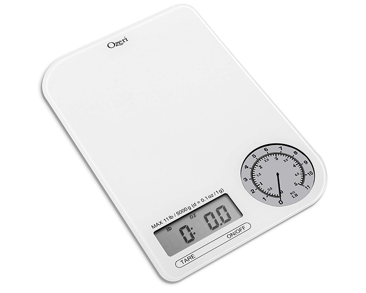 - Visually stunning design incorporates an integrated digital display where precise measurements are needed, and a mechanical dial for viewing measurements of heavier items in both lbs and kg simultaneously.