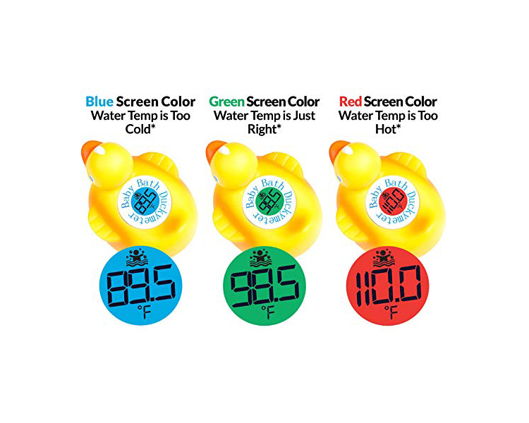 Introducing the Duckymeter, a Baby Bath thermometer built into a fun and safe Duck Bath Toy. The Duckymeter activates instantly in water with no annoying buttons or switches. The Duckymeter dynamically calculates the bath water temperature every second, and displays the temperature with 3 different color screens, with Blue indicating Cold, Red indicating Hot, and Green indicating Just Right. Compliant with the Consumer Product Safety Improvement Act, the Duckymeter is safe and fun both in and out of the bath. Ships with 3 AAA batteries included.