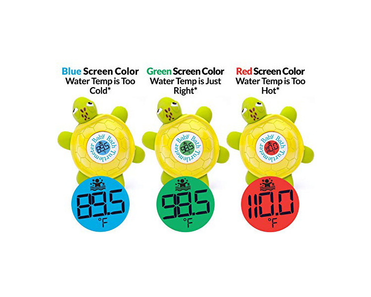 Introducing the Turtlemeter, the first Baby Bath Thermometer built into a fun and safe Turtle Bath Toy. The Turtlemeter activates instantly in water with no annoying buttons or switches. The Turtlemeter dynamically calculates the bath water temperature every second, and displays the temperature with 3 different color screens, with Blue indicating Cold, Red indicating Hot,and Green indicating Just Right. Compliant with the Consumer Product Safety Improvement Act, the Turtlemeter is safe and fun both in and out of the bath. Ships with 3 AAA batteries included.
