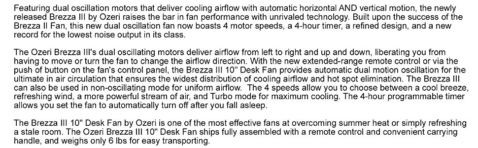 The Brezza III can also be used in non-oscillating mode for uniform airflow. The 4 speeds allow you to choose between a cool breeze, refreshing wind, a more powerful stream of air, and Turbo mode for maximum cooling. The 4-hour programmable timer allows you set the fan to automatically turn off after you fall asleep. The Brezza III 10" Desk Fan by Ozeri is one of the most effective fans at overcoming summer heat or simply refreshing a stale room. The Ozeri Brezza III 10" Desk Fan ships fully assembled with a convenient carrying handle, and weighs 6 lbs for easy transporting.