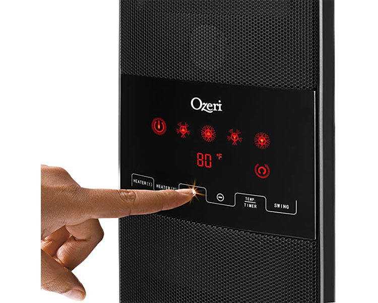 Ozeri is proud to present its OZH1 dual zone oscillating ceramic heater. The Ozeri OZH1 provides rapid heat on a wintry night with a programmable 12-hour timer and thermostat so that you can sleep in comfort. The OZH1 dual zone oscillating ceramic heater features a sleek space-saving design enhances room decor, with a sturdy glass base designed to reduce the occurrence of accidental tip overs. The OZH1 utilizes a touch-button illuminated LED display that boasts a better viewing angle and common LCD displays, and an extended-range remote control unit for maximum convenience. The OZH1 utilizes dual PTC ceramic heating systems to allow for 2 independently controllable heating zones, each with 2 speeds for rapid heat distribution at 800 W (low) or 1500W (high). it also includes overheat protection to prevent irritating dust burning odors, and an intelligent thermostat that adjusts heat output according to the ambient temperature, and automatically turns off when the selected temperature is reached. The OZH1 dual zone oscillating ceramic heater utilizes a new whisper quiet DC motor that generates warming air with the lowest possible noise coefficient, and dismountable dustproof filters for easy cleaning. It measures 33.5 inch in height and includes a Recessed handle for easy transporting. Your satisfaction is guaranteed.