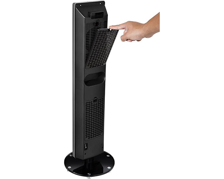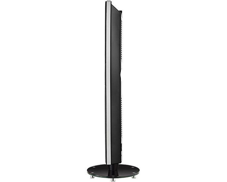 - Ultra thin space-saving design enhances room decor and features a touch button LED display, and an elegant sturdy glass base that reduces accidental tip-over.
