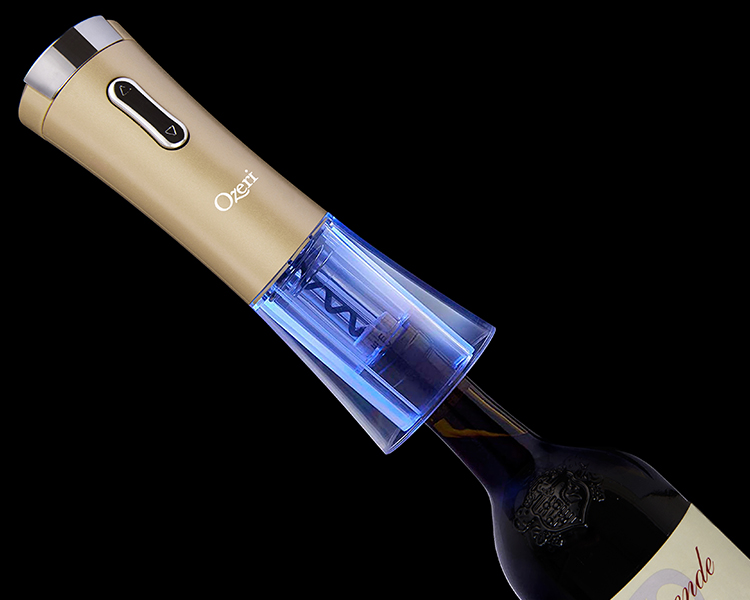 The Ozeri Nouveaux Electric Wine Opener combines an European inspired cordless design with a new ultra fast rechargeable motor that opens up to 40 bottles, all on a single charge. With the Ozeri Nouveaux Electric Wine Opener, opening a bottle of wine is effortless, quick and entertaining. The Nouveaux introduces a celebrated design incorporating elegant curves that allow it to stand vertically without the use of a separate base or stand. Designed for home and restaurant use, the Ozeri Nouveaux Electric removes a wine bottle cork with the gentle push of a button. Unlike other electric wine openers, it features a transparent corkscrew shell that makes the cork removal process completely visible. When in use or while being recharged with the included USB-A to USB-C fast-charging cable, the Nouveaux illuminates its transparent bottom shell with calming blue indicator lights. A completely cordless wine opener, the Nouveaux opens both natural and synthetic corks, and features an ergonomic grip for easy handling. With its fashionable design, high quality materials and durable construction, The Ozeri Nouveaux Electric Wine Opener is the ultimate companion to every wine bottle.