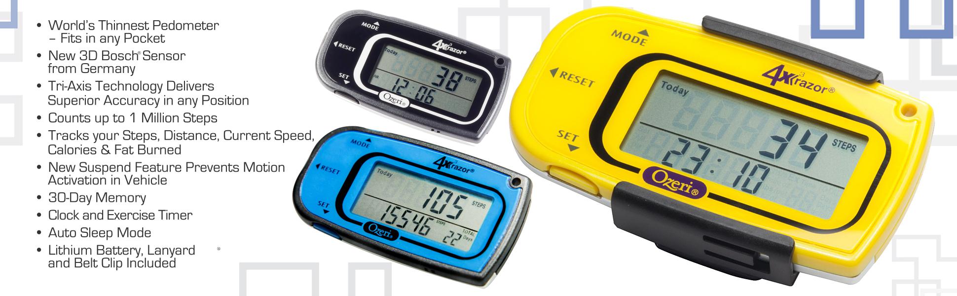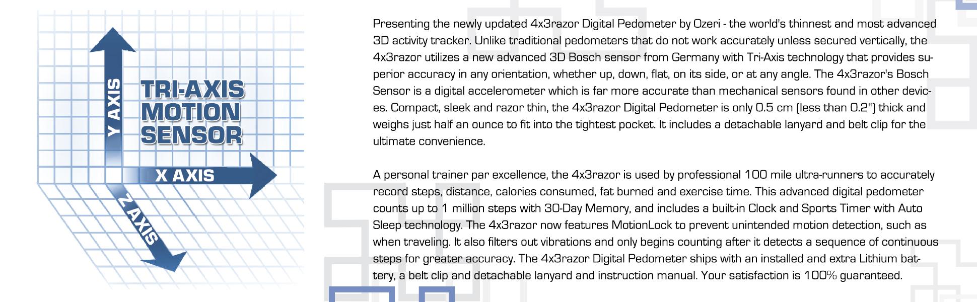 Presenting the newly updated 4x3razor Digital Pedometer by Ozeri - the world's thinnest and most advanced 3D activity tracker. Unlike traditional pedometers that do not work accurately unless secured vertically, the 4x3razor utilizes a new advanced 3D Bosch sensor from Germany with Tri-Axis technology that provides superior accuracy in any orientation, whether up, down, flat, on its side, or at any angle. The 4x3razor's Bosch Sensor is a digital accelerometer which is far more accurate than mechanical sensors found in other devices. Compact, sleek and razor thin, the 4x3razor Digital Pedometer is only 0.5 cm (less than 0.2") thick and weighs just half an ounce to fit into the tightest pocket.