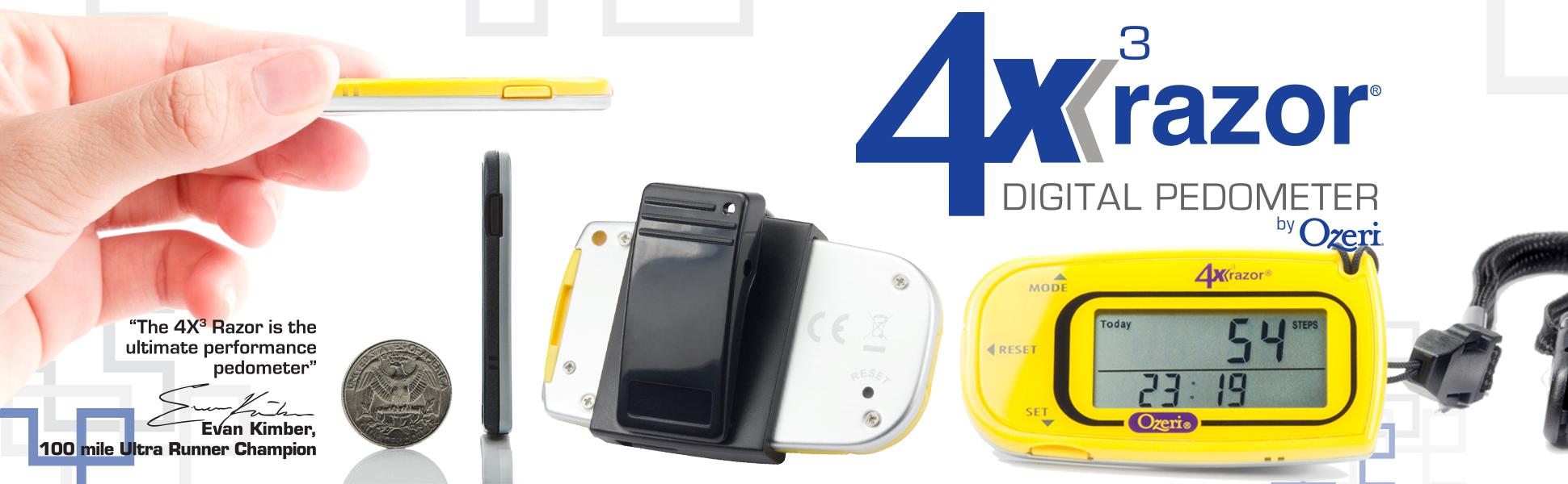 - Designed for high-performance athletes, the 4x3razor is the world's thinnest and lightest pedometer -- 0.5cm (less than 0.2") thick and weighs just half an ounce.