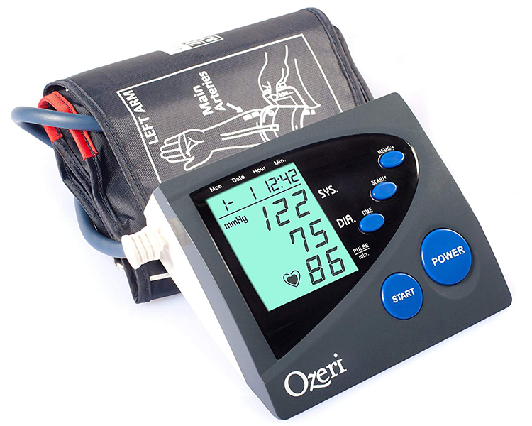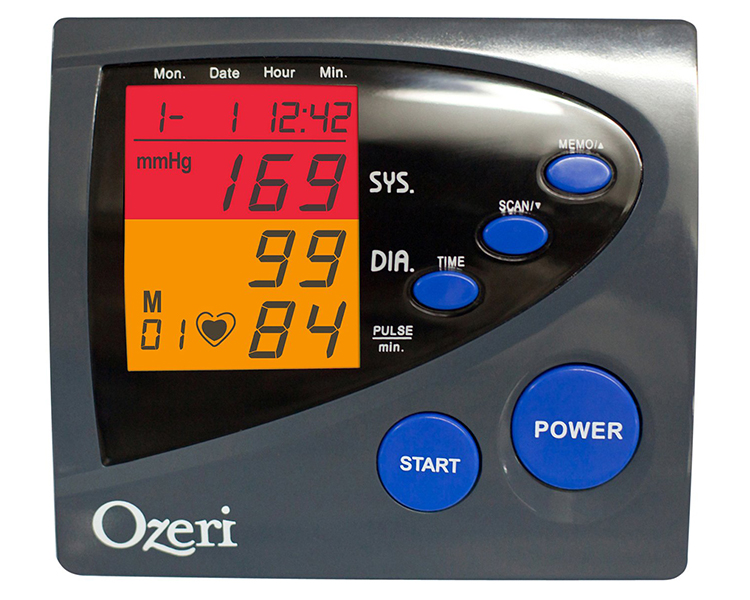 The Ozeri CardioTech Premium Series Digital Blood Pressure Monitor stores up to 1197 blood pressure readings with date and time Memory recall (399 readings x 3 users), and automatically classifies each blood pressure reading according to World Health Organization hypertension guidelines with a new Color Alert LCD that color codes the systolic and diastolic readings according to green (normal), orange (prehypertension) and red (hypertension) levels. It also calculates average blood pressure readings based on the 3 most recent readings, and detects irregular heart (Arrhythmia) for an improved understanding of your heart's health. Compact, portable and simple-to-use, the Ozeri CardioTech Blood Pressure Monitor is backed by a 5 year warranty and ships with 4 AA batteries, a carrying case and user manual.