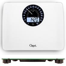 The Ozeri Rev Digital Bathroom Scale with Electro-Mechanical Weight Dial is the world's first weight scale to incorporate a synchronized electro-mechanical Dial and LCD that automatically illuminate and point to your weight in lbs and kg, for easy-to read results in all light conditions and from any angle. Boasting a visually arresting design, the Ozeri Rev scale features a huge 5.5 inch mechanical dial display with an integrated digital blue-backlit LCD, accented by stylish chrome to create a distinctive retro look, and displays digital results with class-leading 50 gram Sensor Technology. This professional quality scale features an oversized platform made of impact-resistant tempered glass with slip-resistant feet for ideal stability, and a new built-in alarm that reminds you to measure your weight at the same time each day. The Ozeri Rev Digital Bathroom Scale uses 4 high-precision sensors that weigh up to 400 lbs (180 kg) in 0.1 lbs or 0.05 kg (50 gram) increments. Whether your goals are weight loss or muscle gain, the Ozeri Rev features the latest generation of StepOn technology to display your precise body weight upon stepping onto the scale, with no tapping required. The Ozeri Rev Digital Bathroom Scale is auto-calibrated and automatically turns off to conserve battery life. It runs on 3 AA batteries (included) and features a Low Battery Indicator. Your Satisfaction is 100% Guaranteed.