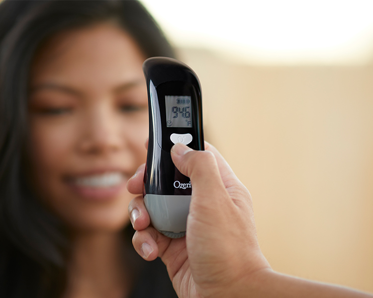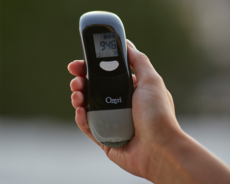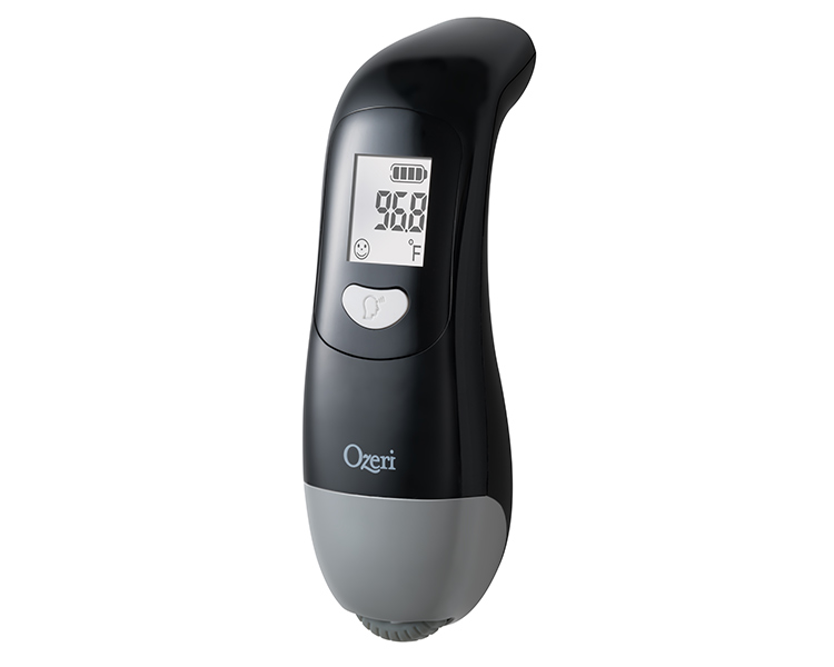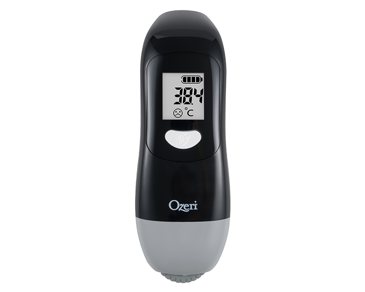 Requiring a simple scroll of the bottom wheel, the Ozeri Kinetic Non-contact Forehead Thermometer converts kinetic energy into a digital charge so that you can accurately check for fever or measure an object’s temperature without ever needing to search for batteries. A few slides of the kinetic wheel conveniently located at the bottom of the thermometer is all it takes to generate a sufficient charge and take an accurate measurement of body temperature. The Ozeri Kinetic Thermometer is designed for both children and adults, and once charged via its kinetic motion technology, generates a precise measurement in as little as a second. The Ozeri Kinetic Thermometer utilizes infrared technology for touchless measuring, without ever requiring contact, for shared and sanitary use. Results are displayed in either Fahrenheit or Celsius to the nearest 0.1°F / 0.1°C, with a measuring range of 93.2°F ~ 109.4°F (34°C ~ 43°C). Though battery-free, the Ozeri Kinetic Thermometer offers all the benefits of modern digital thermometers via its clear LCD that displays measurement results and charge status. Its LCD additionally displays a smiley or frowning face based on the detection of a normal temperature or fever. The Ozeri Kinetic Thermometer generates an audible single beep to confirm a normal temperature, and a long beep followed by a short one as an alarm to indicate the detection of a fever. Clinically validated, and manufactured to ISO 80601-2-56, IEC/EN 60601-1 and IEC/EN 60601-1-2 medical standards, the battery-free Ozeri Kinetic Non-contact Forehead Thermometer is backed by Ozeri’s No-Hassle Warranty, with your satisfaction guaranteed.