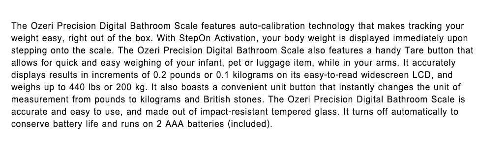 The Ozeri Precision Digital Bathroom Scale features auto-calibration technology that makes tracking your weight easy, right out of the box. With StepOn Activation, your body weight is displayed immediately upon stepping onto the scale. The Ozeri Precision Digital Bathroom Scale also features a handy Tare button that allows for quick and easy weighing of your infant, pet or luggage item, while in your arms. It accurately displays results in increments of 0.2 pounds or 0.1 kilograms on its easy-to-read widescreen LCD, and weighs up to 440 lbs or 200 kg. It also boasts a convenient unit button that instantly changes the unit of measurement from pounds to kilograms and British stones. The Ozeri Precision Digital Bathroom Scale is accurate and easy to use, and made out of impact-resistant tempered glass. It turns off automatically to conserve battery life and runs on 2 AAA batteries (included).