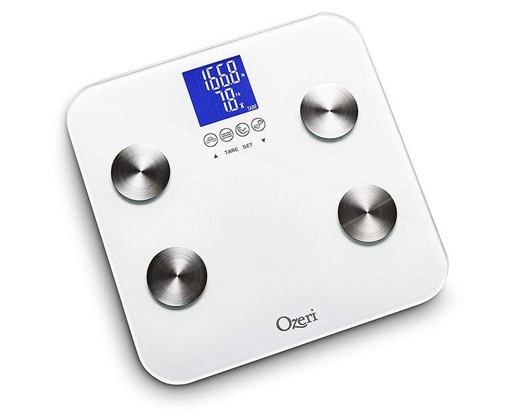 Newly updated, the Ozeri Touch 440 lbs Total Body Scale now provides instant adult and infant weight measurements, and calculates body fat, hydration, muscle mass and bone measurements. Embedded with StepOn technology, it automatically powers on upon contact and features 3 touch sensitive buttons for easy operation. It also features 4 icons that automatically illuminate on the screen for body fat, hydration, muscle and bone measurements. The Ozeri Touch includes built-in memory for up to 8 users with auto recognition technology for shared use at home, the office or the gym. Each profile stores weight, gender, height, and age data so that your family members can each track their progress. The Ozeri Touch Total Body Scale combines advanced algorithms with bioelectrical impedance analysis (BIA), incorporating a person's age, height, gender and weight, for its accurate measurements. BIA is a well-established and respected method used to estimate body fat, hydration, muscle mass and bone measurements. The Ozeri Touch Total Body Scale displays all results on its easy to read high-contrast LCD screen.