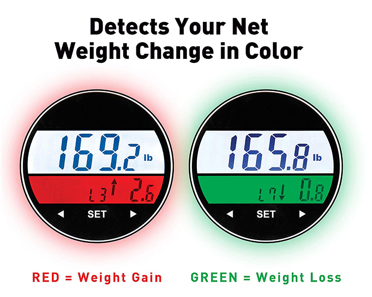 - Smart LCD with Color Alert Technology – Allows you to focus on your weight trend instead of the actual numbers by displaying your weight change in color, with a GREEN illumination for weight loss and RED for weight gain.