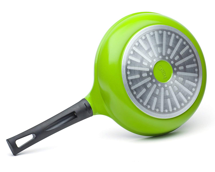 Utilizing pure ceramic as a coating, the Green Ceramic Pan by Ozeri achieves non-stick perfection while remaining absolutely free of PTFE, PFAS and GenX chemicals (APEO, PFBS, PFOS, PFOA). Conventional cookware and other ceramic cookware brands achieve their non-stick performance through a coating of PTFE, a synthetic substance that has waxy properties. At very high temperatures, PTFE can begin to decompose and release fumes which are documented to be lethal to birds and small pets, and which can be harmful to humans. Although acids PFOA and PFOS have been generally phased out of cookware production as persistent pollutants, non-stick coatings today are often made with the aid of a new generation of advanced fluoropolymers, known as GenX fluorinated chemicals and PFBS. Data from research on these chemicals shows that they are suggestive of cancer and when orally consumed, these chemicals may be harmful to health. The Green Ceramic Pan's 100% ceramic coating is completely free of PTFE, PFAS and GenX fluoropolymers. With exceptional non-stick properties, the Green Ceramic Pan by Ozeri allows you to saute, fry, bake, boil and braise with as little as half the amount of oil normally used, and it makes cleaning a breeze. The Green Ceramic Pan by Ozeri is made of the highest quality die-cast aluminum that allows for even cooking and fantastic browning without the risk of hot spots. It boasts a magnetized bottom for rapid heat transfer on induction stoves, and a heat resistant Bakelight handle.