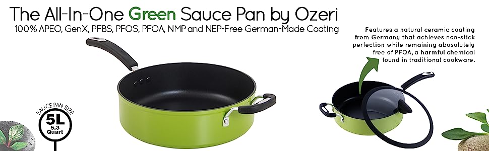 - Eco-friendly 5 L (5.3 Quart) sauce pan delivers unprecedented non-stick performance without risk of exposure to these controversial chemicals.