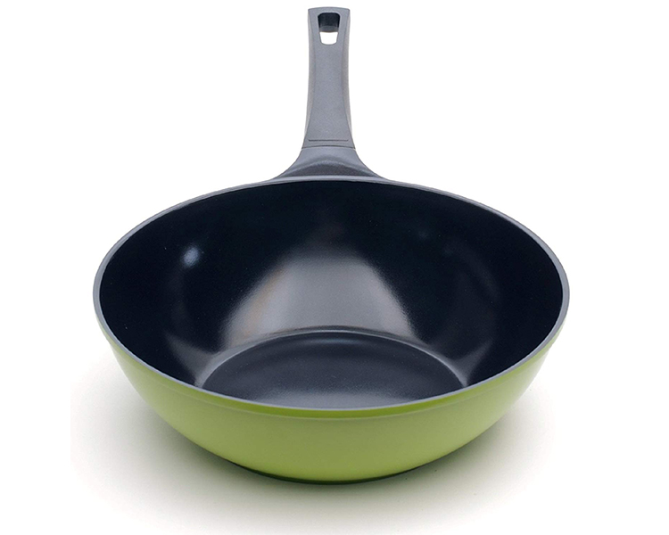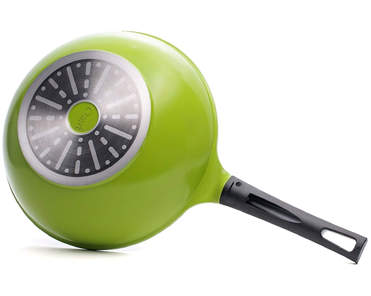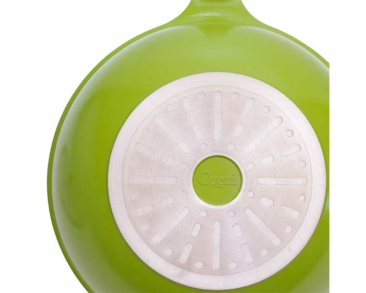 Utilizing pure ceramic as a coating, the Green Ceramic Wok by Ozeri achieves non-stick perfection while remaining absolutely free of PTFE, PFAS and GenX chemicals (APEO, PFBS, PFOS, PFOA). Conventional cookware and other ceramic cookware brands achieve their non-stick performance through a coating of PTFE (PolyTetraFluoroEthylene), a synthetic substance that has waxy properties. At very high temperatures, PTFE can begin to decompose and release fumes which are documented to be lethal to birds and small pets, and which can be harmful to humans. Although acids PFOA and PFOS have been generally phased out of cookware production as persistent pollutants, non-stick coatings today are often made with the aid of a new generation of advanced fluoropolymers, known as GenX fluorinated chemicals and PFBS. Data from research on these chemicals shows that they are suggestive of cancer and when orally consumed, these chemicals may be harmful to health. The Green Ceramic Wok's 100% ceramic coating is completely free of PTFE, PFAS and GenX fluoropolymers. In addition to being eco-friendly and ultra-safe, the Green Ceramic Wok's ceramic coating is far more durable and scratch-resistant than other non-stick surfaces. With exceptional non-stick properties, the Green Ceramic Wok by Ozeri allows you to saute, fry, bake, boil and braise with as little as half the amount of oil normally used, and it makes cleaning a breeze. The Green Ceramic Wok by Ozeri is made of the highest quality die-cast aluminum that allows for even cooking and fantastic browning without the risk of hot spots. It boasts a magnetized bottom for rapid heat transfer on induction stoves, and a heat resistant Bakelite handle.