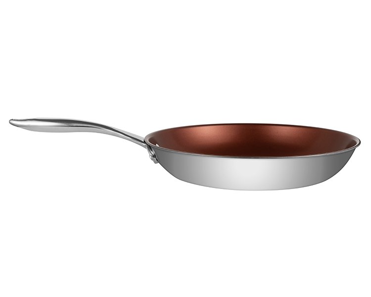Featuring ETERNA -- a safe and durable non-stick coating developed in the USA, the Stainless Steel Pan by Ozeri is the world’s first stainless steel frying pan to achieve non-stick perfection without using PFOA or APEO -- harmful chemicals often found in traditional cookware. Conventional pans achieve their non-stick performance with the aid of PFOA (PerFluoroOctanoic Acid), a potential carcinogen which the EPA has classified as a 'persistent pollutant of the environment', and APEO (Alkylphenol ethoxylates), which are under restricted use in Germany due to environmental concerns about their poor biodegradability and toxicity in the food chain. According to the EPA, once ingested, PFOA is capable of remaining in people for a very long time, and has been shown to cause developmental and other adverse effects in laboratory animals. Likewise, European studies have shown that APEO may be toxic to aquatic life, and has the potential to act as endocrine disrupters. With the Stainless Steel Pan’s ETERNA coating, even under high temperatures, no controversial perfluorinated chemicals are ever released into the environment. This is because the Stainless Steel Pan utilizes a safer non-stick coating that is completely free of PFOA, and far more durable and scratch-resistant than other non-stick surfaces. With better non-stick properties, the Stainless Steel Pan allows you to saute, fry, bake, boil and braise with as little as half the amount of oil normally used, and cleaning is a breeze. The Stainless Steel Pan by Ozeri is made of the highest quality stainless steel with TriPly construction, delivering the ultimate in heat conductivity for even cooking and browning without hot spots. It boasts a magnetized bottom for rapid heat transfer on induction stoves, and a polished mirror exterior. ETERNA coating made by Whitford USA. Final pan assembly in China.