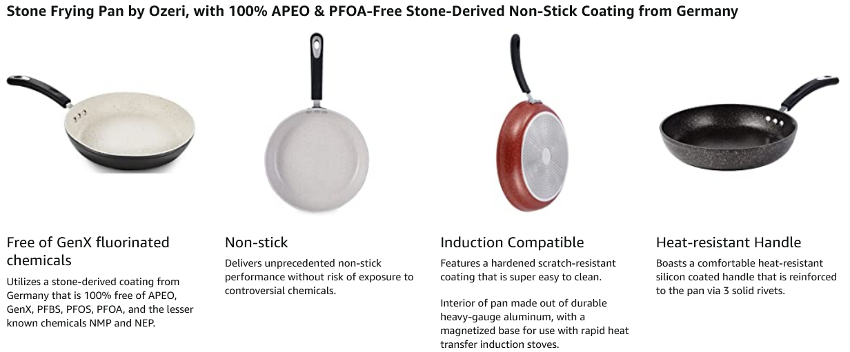 Utilizing a custom-formulated stone-derived coating from Germany, the Stone Frying Pan by Ozeri reigns with its ability to deliver non-stick perfection while remaining absolutely free of toxic substances such as APEO, GenX fluorinated chemicals, PFBS, PFOS, PFOA, and the lesser known chemicals NMP and NEP. According to the FDA, many of these chemicals constitute a worrisome class of nonstick and stain-resistant compounds that have found their way into the food chain, including grocery store meats and seafood. A federal toxicology report has linked a number of health concerns to the presence of these compounds in people’s blood. Although the harmful acid PFOA, and to a certain extent PFOS, have been generally phased out of production, non-stick coatings today are often made with the aid of a new generation of advanced fluoropolymers, known as GenX fluorinated chemicals and PFBS. According to EPA studies on these chemicals, the “data are suggestive of cancer” and when orally consumed, these chemicals may be capable of affecting the kidneys, blood, immune system, liver and developing fetuses. Also of concern are APEO chemicals (Alkylphenol ethoxylates), which are under restricted use in Germany due to environmental concerns and toxicity in the food chain.