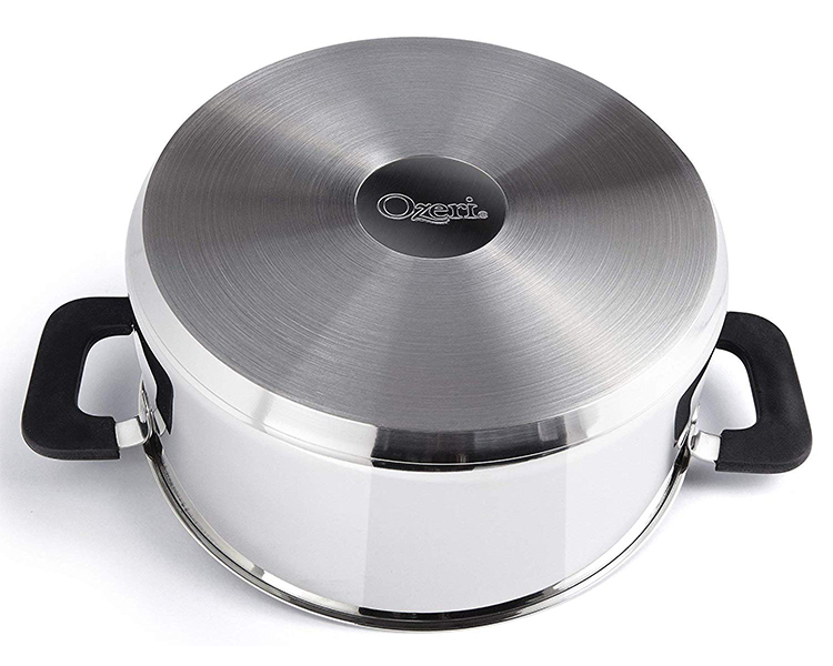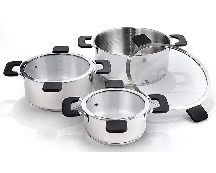 - Versatile and stackable set includes a 4.5 L (4.8 quart), 2.7 L (2.9 quart), and 1.3 L (1.4 quart) Stainless Steel pot, with Ozeri patent-pending straining and hands-free glass lids.