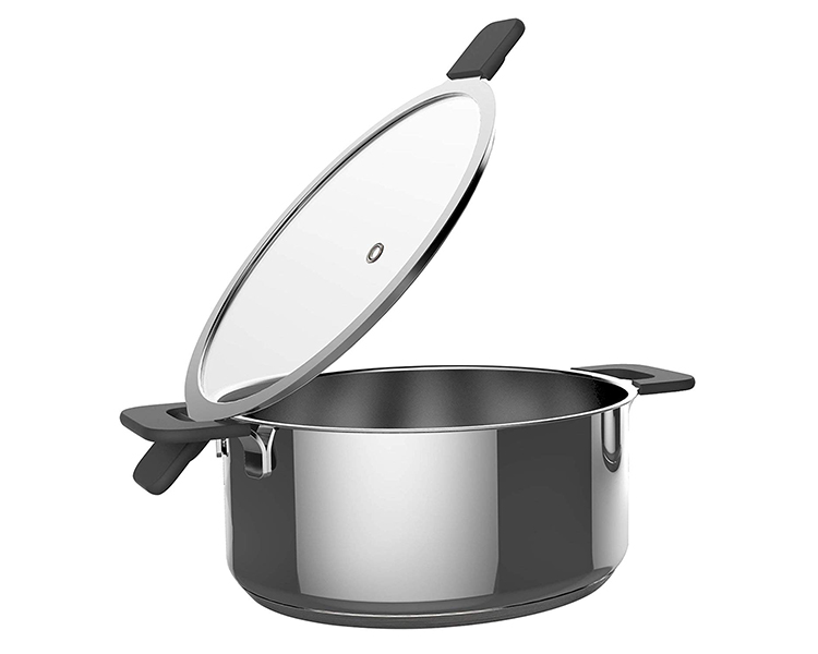- Uniquely fitted lids made of tempered glass, each with a Steam-Release vent and two heat-resistant silicone-coated handles.